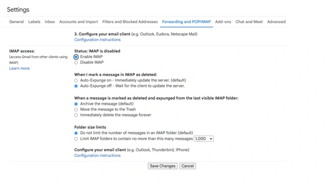 - IMAP — พอร์ต 143 และ 993 : พอร์ตแรกเป็นพอร์ตมาตรฐานที่ไม่ได้เข้ารหัสสำหรับ IMAP ในขณะที่พอร์ตหลังเป็นพอร์ตที่แนะนำพร้อมการเข้ารหัส SSL/TLS คุณสามารถใช้พอร์ตใดพอร์ตหนึ่งได้ขึ้นอยู่กับความต้องการด้านความปลอดภัยของคุณ