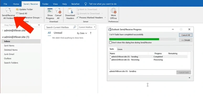 หลักจากตั้งค่าเรียบร้อยแล้ว ฝั่งซ้ายจะมีอีเมลเพิ่มขึ้นมา ให้กดที่ Email >> inbox >> Send and Receive all folders