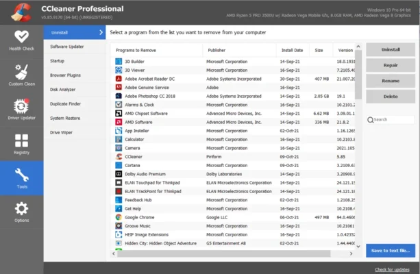 CCleaner Professional คือ โปรแกรมที่ช่วยในการลบไฟล์ขยะต่างๆในเครื่องคอม ไฟล์ที่ไม่จำเป็นในระบบ ที่โดยทั่วๆไปไม่สามารถลบออกได้ ไฟล์ประวัติการเข้าใช้งาน การเข้าถึงเว็บไซต์ (History Files) รวมถึงไฟล์คุกกี้(Cookies) ที่ใช้ในการจดจำรหัสผ่าน ชื่อบัญชีผู้ใช้ หรือค่าต่างๆ ระหว่างการเข้าใช้งานอินเทอร์เน็ต นอกจากนี้แล้วในรุ่น Professional นั้นยังมีฟังก์ชั่นต่างๆเพิ่มขึ้นมา เช่น การช่วยลบโปรแกรมแบบขั้นสูง การช่วยค้นหาและติดตั้งไดฟ์เวอร์ในคอมพิวเตอร์ รวมถึงการวิเคราะห์คอมพิวเตอร์ของเรา และจัดการไฟล์ขยะ หรือไฟล์ต่างๆที่ไม่จำเป็นในระบบเพื่อให้คอมของเราทำงานได้ อย่างรวดเร็ว และมีประสิทธิภาพมากขึ้น
